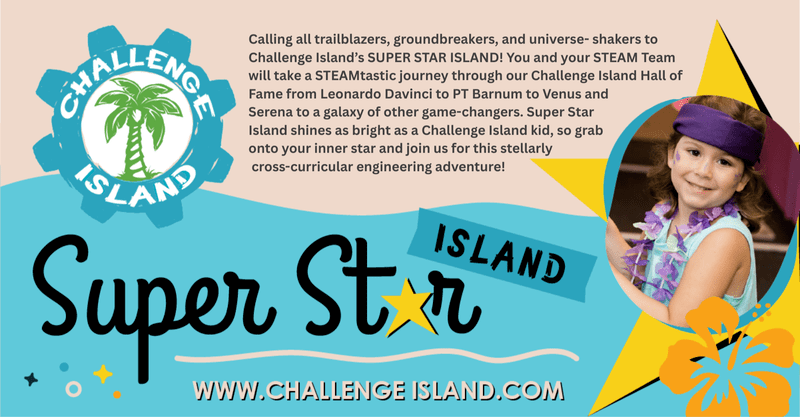 Calling all trailblazers, groundbreakers, and universe-shakers to Challenge Island's SUPER STAR ISLAND! You and your STEAM Team will take a STEAMtastic journey through our Challenge Island Hall of Fame from Leonardo Da Vinci to P.T. Barnum to Venus and Serena to a galaxy of other game-changers. Super Star Island shines as bright as a Challenge Island kid, so grab onto your inner star and join us for this stellarly cross-curricular engineering adventure!