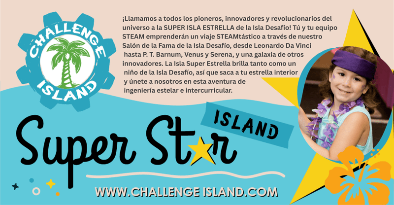 ¡Llamamos a todos los pioneros, innovadores y revolucionarios del universo a la SUPER ISLA ESTRELLA de la Isla Desafío! Tú y tu equipo STEAM emprenderán un viaje STEAMtástico por nuestro Salón de la Fama de la Isla Desafío, desde Leonardo Da Vinci hasta P.T. Barnum, Venus y Serena y una galaxia de otros innovadores. La Isla Super Estrella brilla con la misma intensidad que un niño de la Isla Desafío, así que saca tu estrella interior y únete a nosotros en esta aventura de ingeniería intercurricular estelar.
