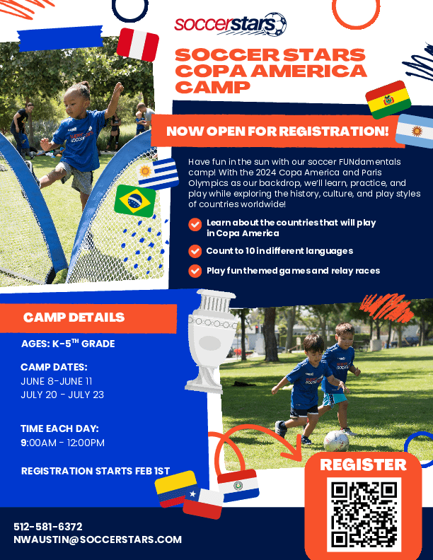 Get ready for a high-energy soccer adventure with our Super Soccer Stars Copa America Camp! Players will build confidence and skills through age-appropriate, daily themes like dribbling for possession, teamwork and passing, 1v1 defending, and goal-scoring techniques. Each day is designed to boost ball control, movement, and decision-making, all while having a blast on the field. Whether your child is just starting or ready to level up, this camp is the perfect blend of fun and fundamentals!