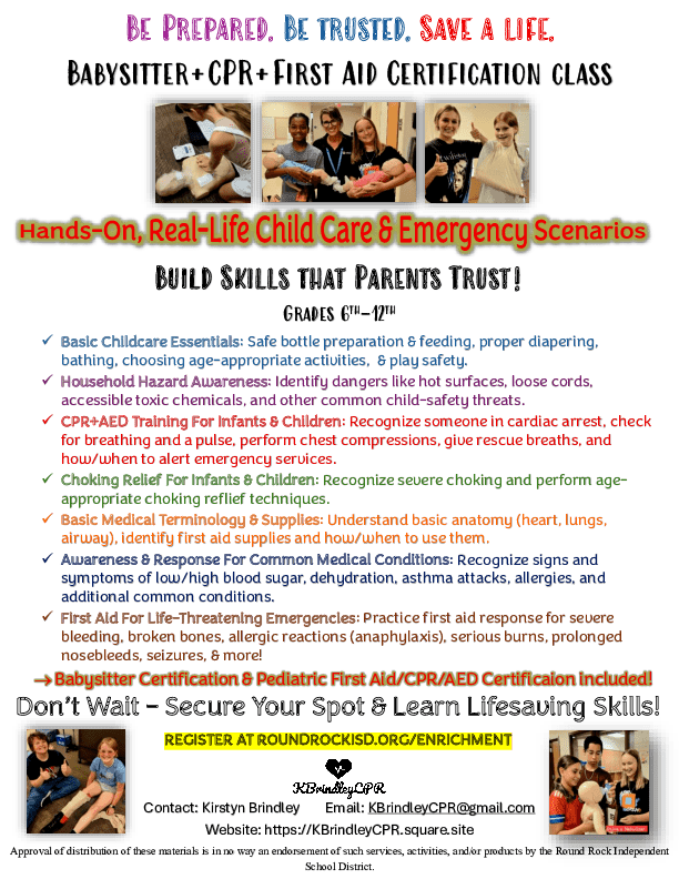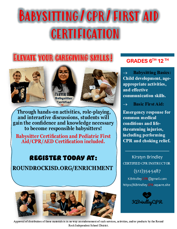 This class concludes with a Babysitting Certification from American Red Cross that includes child and infant CPR.