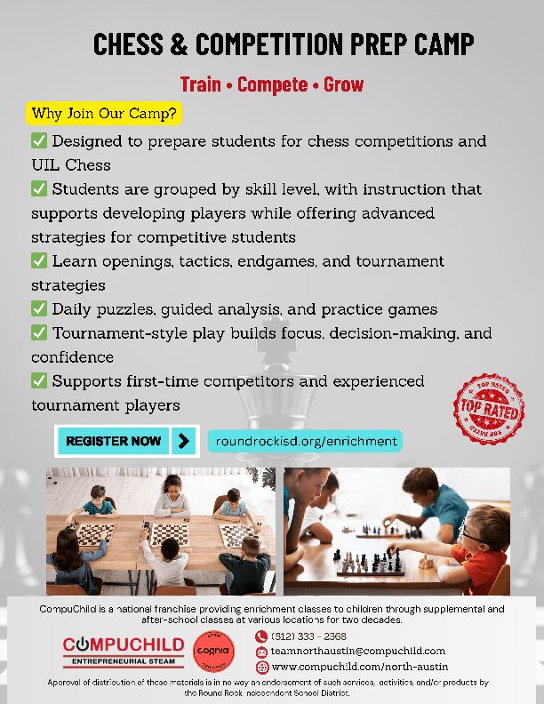 Think fast, play smart, win big! In Chess & Competition Prep Camp, students sharpen their chess strategy and analytical thinking through daily lessons, tactical puzzles, and exciting tournaments. Campers master openings, endgames, and strategic play while developing focus, patience, and decision-making skills. Students will also strengthen their competitive edge with UIL-style Math! Through fun, fast-paced problem-solving games, mental math drills, and team challenges, campers boost their speed, accuracy, and confidence. Each activity is designed to enhance logical reasoning and quick thinking—perfect preparation for competitions while building lifelong critical thinking skills.