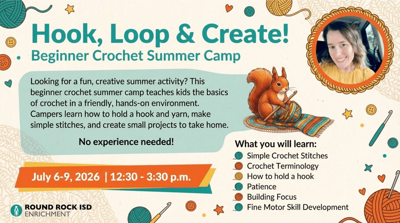 Looking for a fun, creative summer activity? Our Beginner Crochet Summer Camp teaches kids the basics of crochet in a friendly, hands-on environment. Campers earn how to hold a hook and yarn, make simple stitches, and create small projects to take home. No experience needed! Crochet helps build focus, patience, and fine motor skills while encouraging creativity in a calm,screen-free space. Kids gain confidence, make friends, and stitch something special each day.