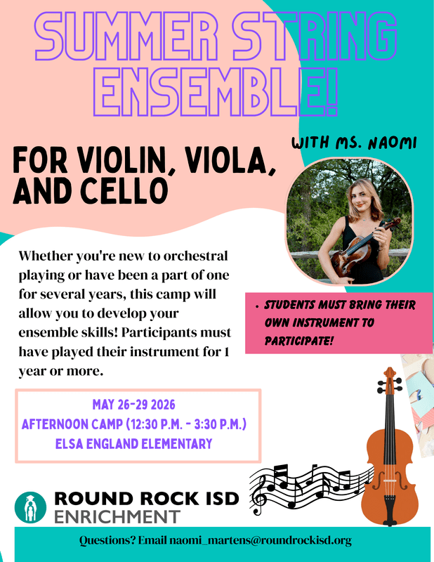 Needed Supplies: Students will need to bring their own instrument, bow, rosin, case, rag, and end pin stop (for cello)
