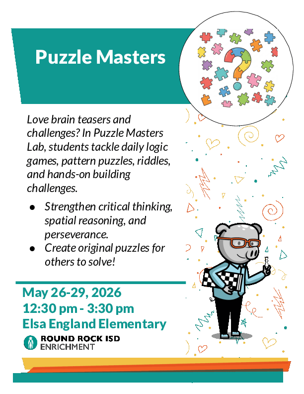 Love brain teasers and challenges? In Puzzle Masters Lab,studentstackle daily logic games, pattern puzzles, riddles, and hands-on building challenges. Campers strengthen critical thinking,spatial reasoning, and perseverance while solving and creating their own puzzles. From logic grids and tiling designs to lateral thinking mysteries, every day brings a new challenge. The week ends with a Puzzle Showcase where students share the original puzzles they designed for others to solve!