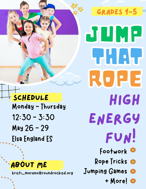 Get ready to get your heart pumping and your feet jumping in this high-energy, action-packed class! Whether you're new to jump rope or looking to enhance your skills, this camp has something for everyone. Master the basics or take your skills to the next level while learning a variety of exciting techniques. CAMP HIGHLIGHTS: Jump Rope Techniques: Learn and practice different styles of jump rope, including single rope, long rope, and partner jumping. Footwork & Tricks: Challenge yourself with fun footwork trickst o add flair to your jumping routine. Rhythmic Chants & Jumping Games: Discover the joy of rhythmic jump rope chants and games that make jumping even more fun. Do your heart a favor—join this energetic class and get moving today!