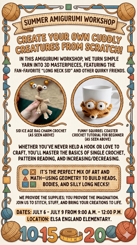 Create your own cuddly creatures from scratch! In this Amigurumi workshop, we turn simple yarn into 3D masterpieces, featuring the fan-favorite "Long Neck Sid" and other quirky friends. Whether you’ve never held a hook or love to craft, you’ll master the basics of single crochet, pattern reading, and increasing/decreasing. It’s the perfect mix of art and math—using geometry to build heads, bodies, and silly long necks! We provide the supplies; you provide the imagination. Join us to stitch,stuff, and bring your creations to life.