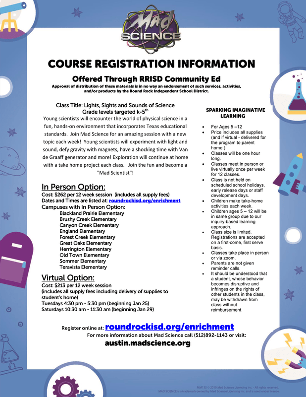 Young scientists will encounter the world of physical science in a fun, hands-on environment that incorporates the educational standards required by the STAAR test. Join Mad Science for an amazing session with a new topic each week! Lights, Sights & Sounds of Science will include the following topics: Harnessing Heat, Magnetic Magic, Optical Illusions, Sonic Sounds, Watts Up, Lights, Color, Action, and more.Young scientists will experiment with light and sound, defy gravity with magnets, have a shocking time with Van de Graaff generator and more! Exploration will continue at home with a take home project each class.Join the fun and become a "Mad Scientist"!